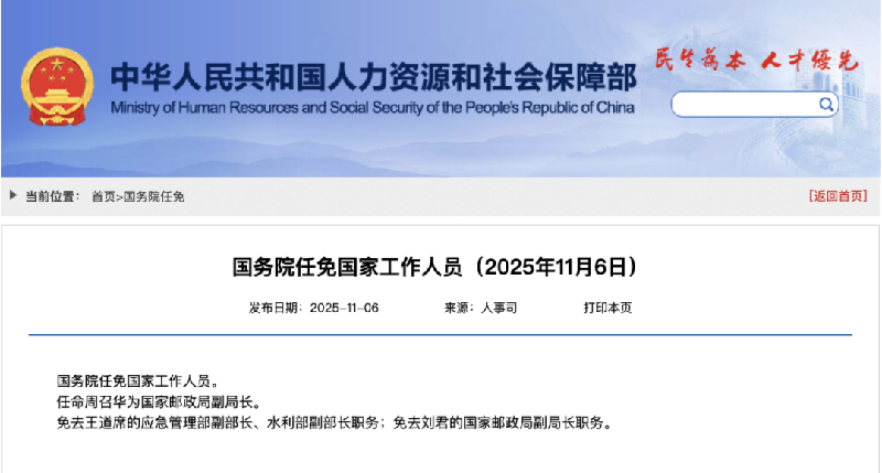 人力资源和社会保障部11月6日消息,国务院任免国家工作人员。