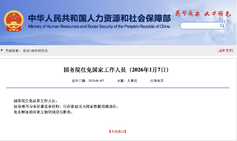 1月7日,人力资源和社会保障部发布消息,国务院任免国家工作人员: