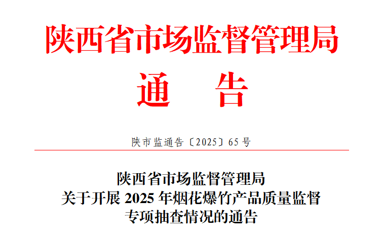 近期,陕西省市场监督管理局组织开展了2025年烟花爆竹产品质量监督专项抽查,现将抽查情况通告如下。