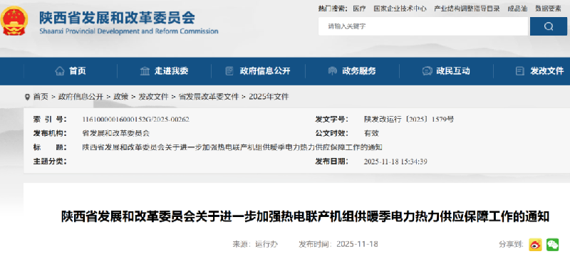 11月18日,陕西省发展和改革委员会发布关于进一步加强热电联产机组供暖季电力热力供应保障工作的通知具体内容如下↓↓↓