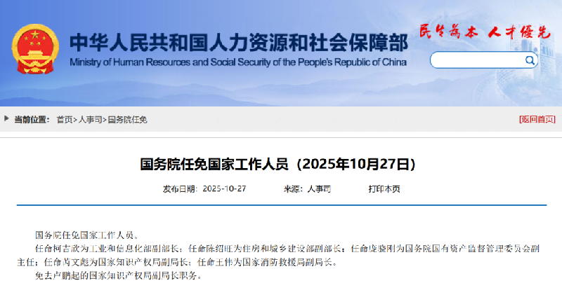 人社部网站10月27日消息,国务院任免国家工作人员。