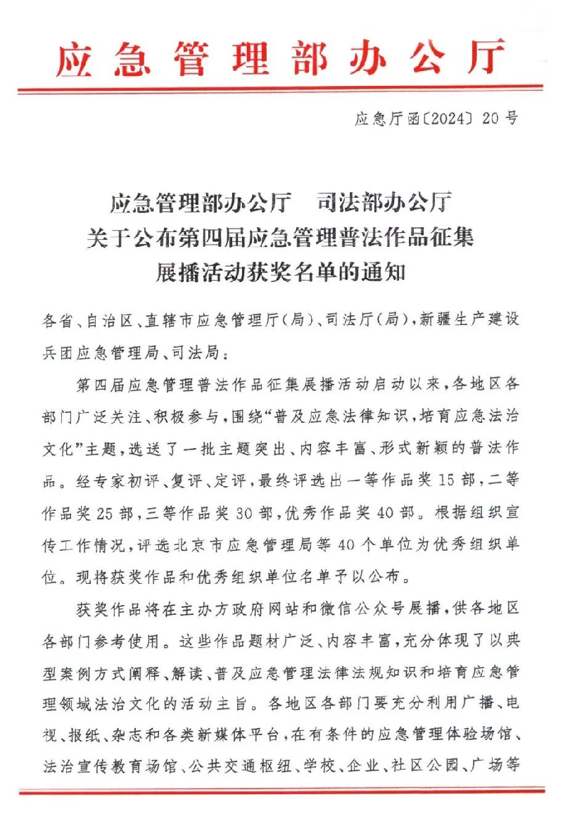 近日,应急管理部办公厅、司法部办公厅公布了第四届应急管理普法作品征集展播活动获奖作品和优秀组织单位名单。陕西省司法厅被评为优秀组织单位,我省报送的《应急侠》《安全是什么》《应急法治卡通画》等应急管理普法作品获奖,充分展示了我省应急管理普法宣传工作成效,迎来我省普法依法治理工作“开门红”。