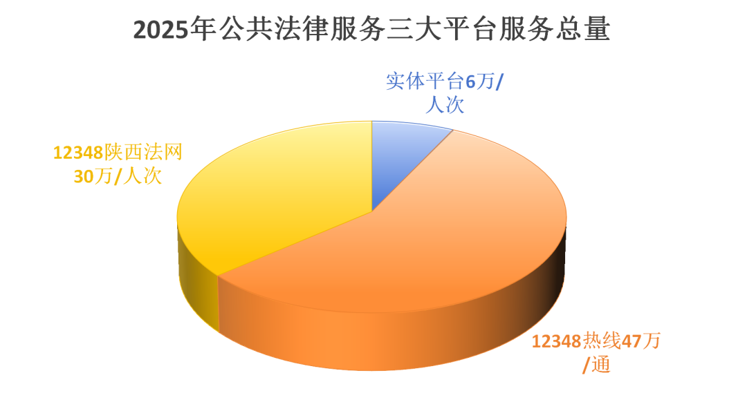 2025年,厅公共法律服务管理处聚焦人民群众法律服务需求,以实体、热线、网络三大平台建设为抓手,着力巩固拓展“半小时公共法律服务圈”建设成果,优化服务流程,创新工作机制,提升惠民实效,覆盖城乡、便捷高效、均等普惠的现代公共法律服务体系基本建成。全省公共法律服务实体平台累计接待群众6万多人次,12348公共法律服务热线累计提供法律咨询超47万通,陕西法律服务网累计访问量30万人次。全年累计办理各类法律服务业务79万余件。