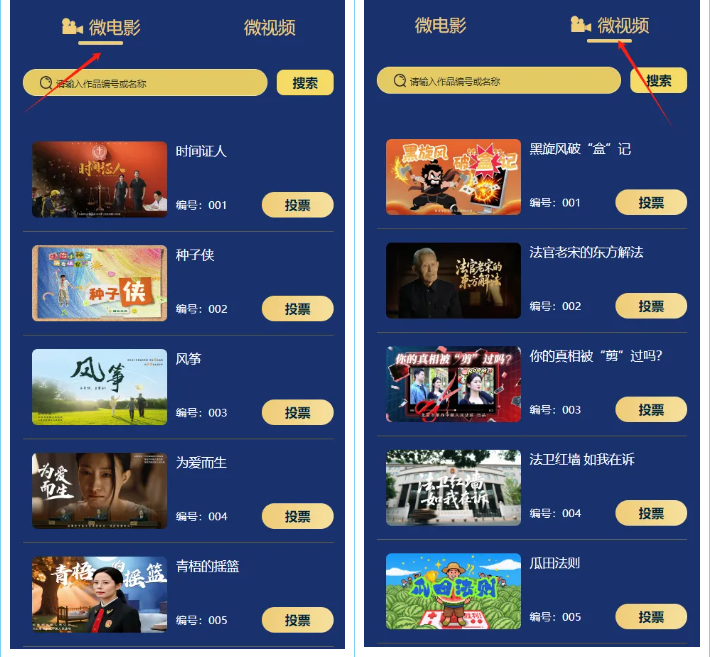 02在投票页面选择“微电影”或“微视频”板块