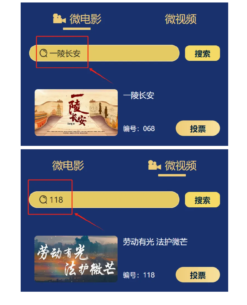 03在搜索框输入作品编号或名称点击“投票”即可