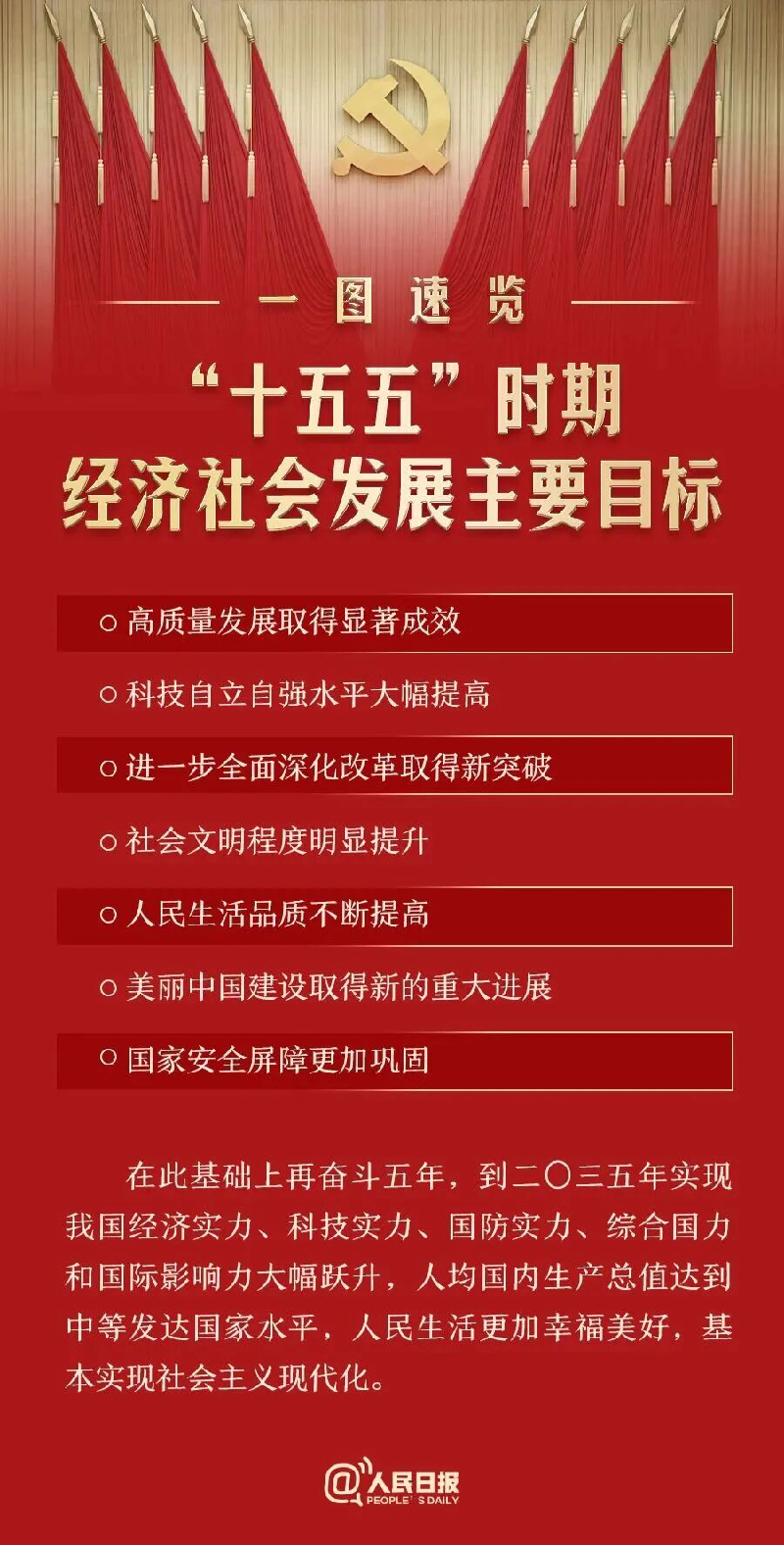 “十五五”时期经济社会发展的主要目标:高质量发展取得显著成效,科技自立自强水平大幅提高,进一步全面深化改革取得新突破,社会文明程度明显提升,人民生活品质不断提高,美丽中国建设取得新的重大进展,国家安全屏障更加巩固。在此基础上再奋斗五年,到二〇三五年实现我国经济实力、科技实力、国防实力、综合国力和国际影响力大幅跃升,人均国内生产总值达到中等发达国家水平,人民生活更加幸福美好,基本实现社会主义现代化。