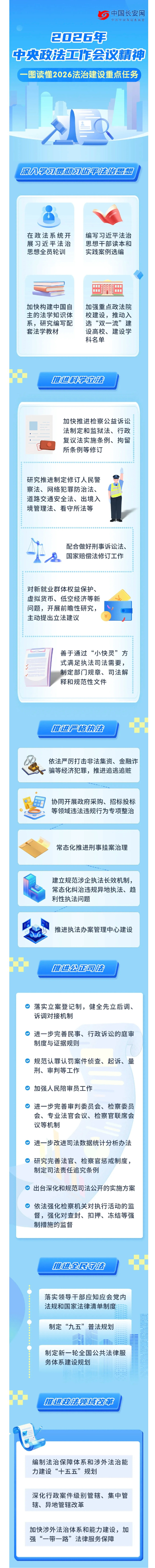 中央政法工作会议近期召开,研究部署了2026年政法工作。会议提出,要开展前瞻性研究,主动提出立法建议的新问题,包括新就业群体权益保护、虚拟货币、低空经济……更多权威信息,一图读懂——