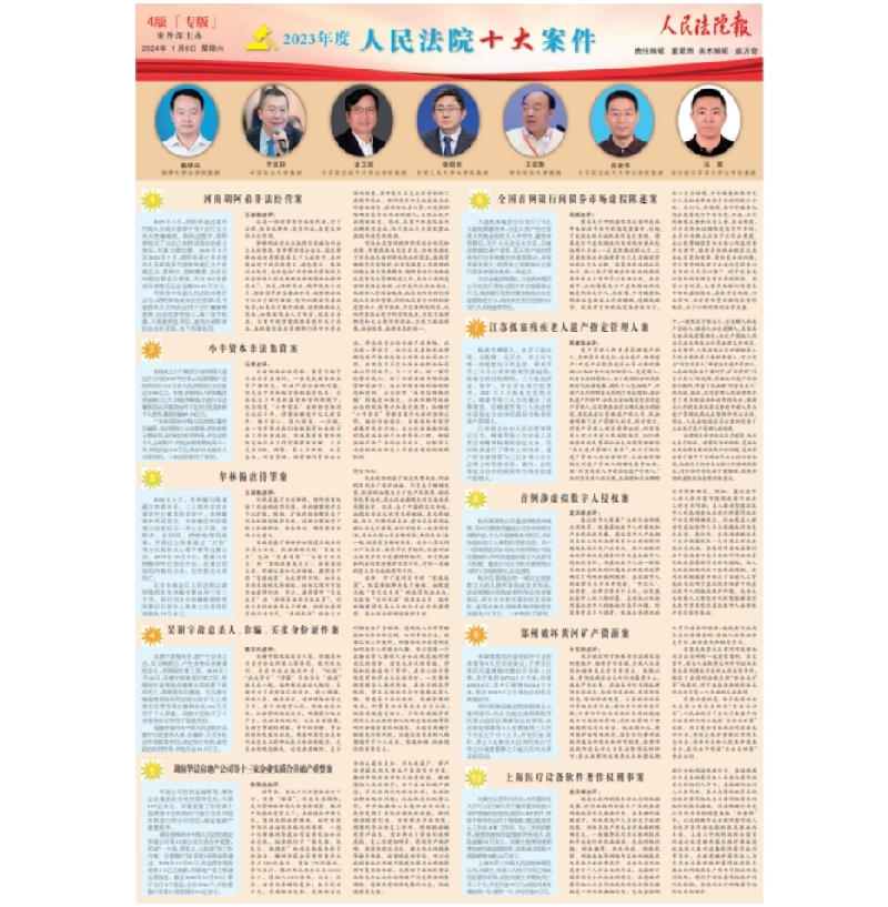 由本报编辑部评选出的2023年度人民法院十大案件今天发布。本次评选的包括刑事、民事在内的十个案件均为本报2023年所报道的具有重大影响力、社会关注度高、裁判结果具有重大意义或重要示范引领作用的案件。
