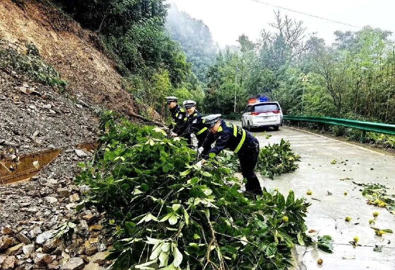 遇到风雨考验的还有渭南公安。10月1日9时30分许,渭南市公安局交警支队临渭大队民警巡逻至渭阳路时,发现一棵行道树树枝因风雨倒伏,占据部分车道。民警迅速设置警示区,冒雨清理树枝,20分钟内恢复通行。同日15时许,渭南白水县公安局交管大队民警在雷牙沟路段发现路面落石,他们一边指挥交通,一边徒手清除障碍,及时消除安全隐患。
