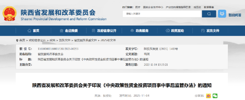 近日陕西省发展和改革委员会发布关于印发《中央政策性资金投资项目事中事后监管办法》的通知具体内容如下↓↓↓