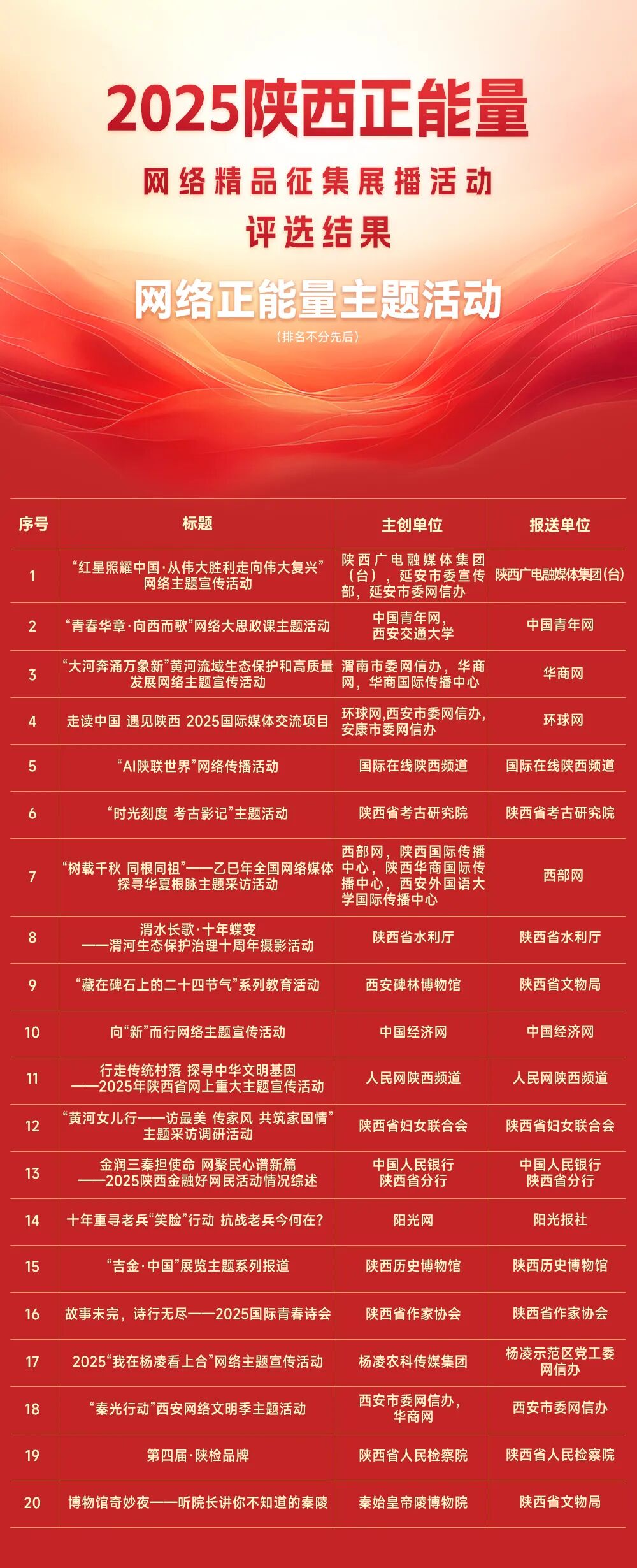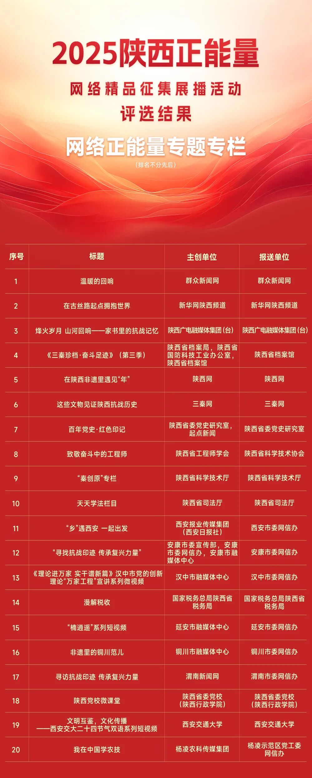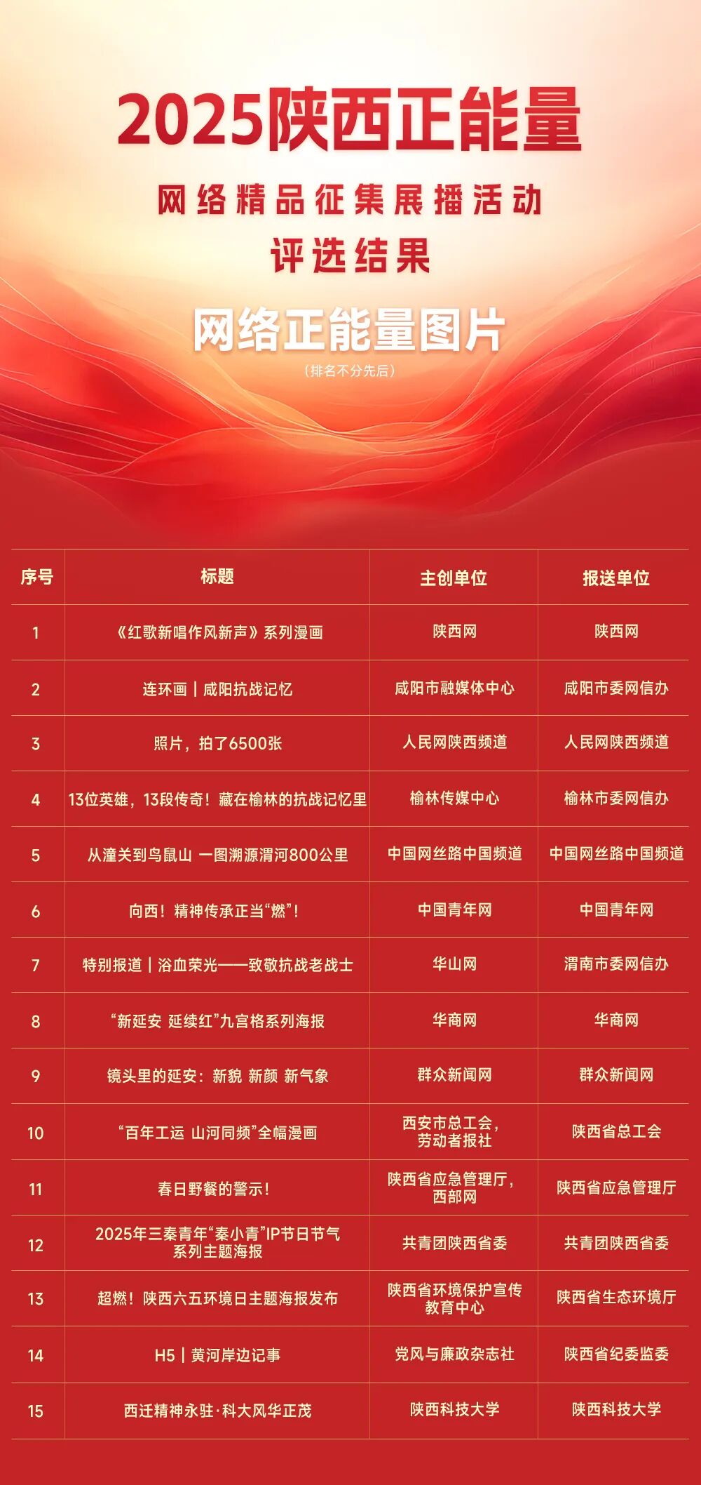 2025陕西正能量网络精品征集展播活动经公开征集、专家评审等环节,100件网络正能量精品脱颖而出。根据活动管理办法及有关工作安排,现对入选作品进行公示。